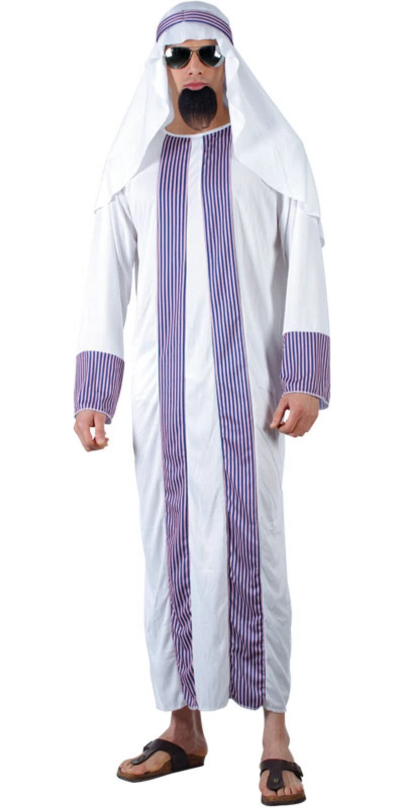Seduce the ladies scare the camels and menace the men is this classic Sheik costume. Your complete costume includes: robe and headpiece This is a fabulous fancy dress costume by Wicked Costumes. Comes complete with it’s own reusable zip up suit carrier bag.