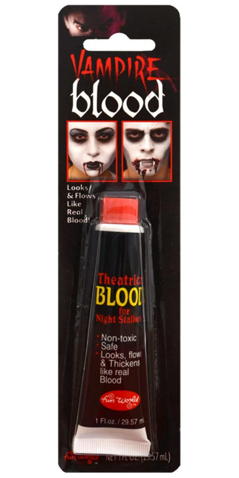 Add some special FX to your fancy dress costume with this gruesome vampire theatrical blood!This fantastic vampire blood looks and flows like real blood and is also easy and safe to use. Ideal for Halloween fancy dress parties and spooky theme nights. The perfect finishing touch to complete your vampire or zombie costume. This theatrical blood washes off easily with mild soap and warm water. Patch test is recommended before use in case of allergic reaction. Check out our fantastic range of costume makeup and accessories available in our online store now.