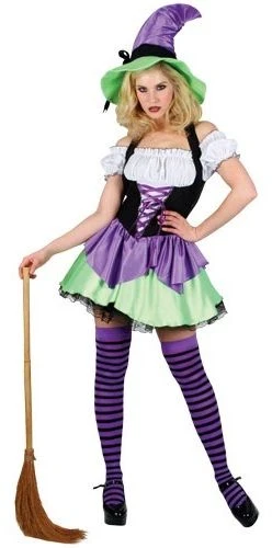 Are you a good witch or a bad witch? Well we’re not in Kansas anymore so you might as well be bad! This Naughty Witch costume has trouble written all over it. Cast a spell in this flirty outfit – the tiered mini skirt will ruffle his feathers and the striped stockings will keep him on his toes!Includes: dress petticoat & hat